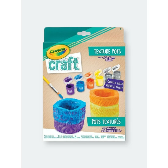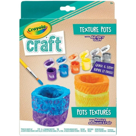 each crayola craft kit offers kids and parents an all-in-one solution for simple crafts with a beautiful outcome this kit includes everything needed to create 2 textured pots using air-dry clay and washable paint sculpted works of art dry without an oven or ceramic kiln required recommended for ages 5 and up safe and nontoxic Skill level: Intermediate